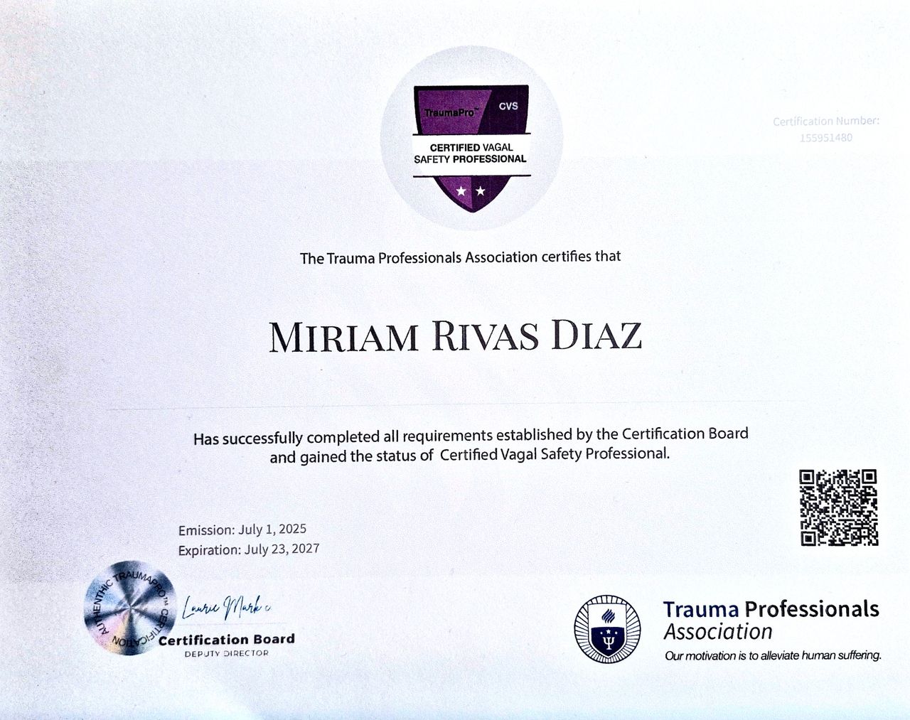 ¡Hola! Mi nombre es Myriam Rivas, soy psicóloga clínica con más de 15 años ayudando a adultos y adolescentes a entender y trabajar sus emociones y a gestionar sus desafíos mentales. He tenido la oportunidad de formarme en diferentes enfoques terapéuticos como el psicoanálisis, la terapia cognitivo-conductual, terapia transpersonal, recién certificada como profesional en "Seguridad Vagal" es decir, habilidades especializadas para trabajar con el nervio vago e intervenciones psicoterapéuticas para su regulación, adapto cada enfoque según las necesidades de cada consultante. Mi experiencia se centra en acompañar a personas con ansiedad, depresión y trastornos de la personalidad, así como en procesos de cambio personal y laboral, conflictos familiares y apoyo en el duelo. Creo firmemente en el poder de la conexión terapéutica y en la importancia de trabajar en equipo con otros especialistas para ofrecer un apoyo completo.